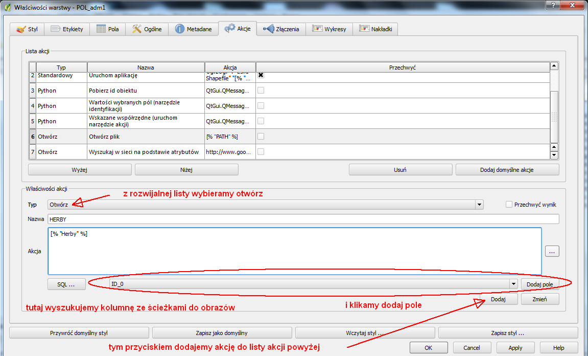 Tak przygotowaną tabelę zapisujemy, a następnie przechodzimy do właściwości warstwy i do zakładki akcje. W oknie lista akcji widzimy jakie mamy możliwości. Następnie we właściwościach warstwy wybieramy typ → otwórz, nazwę dla naszej akcji oraz dodajemy akcję.