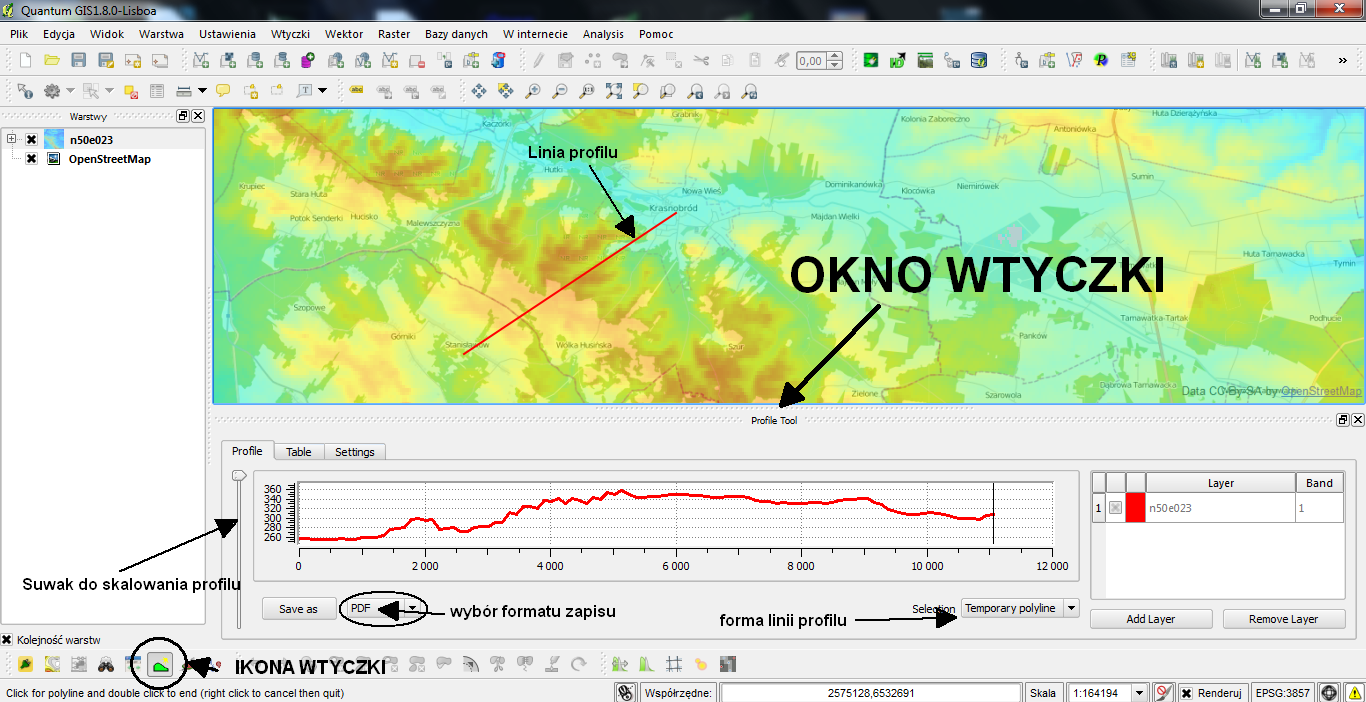 - linia profilu – tymczasowa lub jako liniowa warstwa wektorowa.