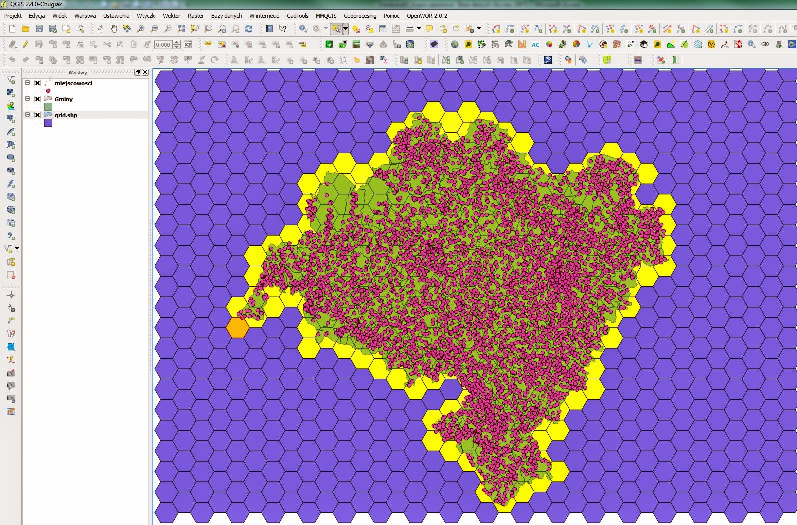 Jednak aby zorientować się o co chodzi z binningiem, najlepiej zobaczyć jak to działa na przykładzie. Poniżej postaram się przedstawić za pomocą QGIS i binningu heksagonalnego ilość miejscowości w poszczególnych gminach Dolnego Śląska.